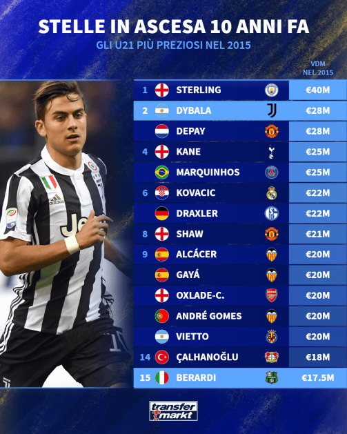 2、迪巴拉,身价2800万欧,彼时效力尤文图斯;