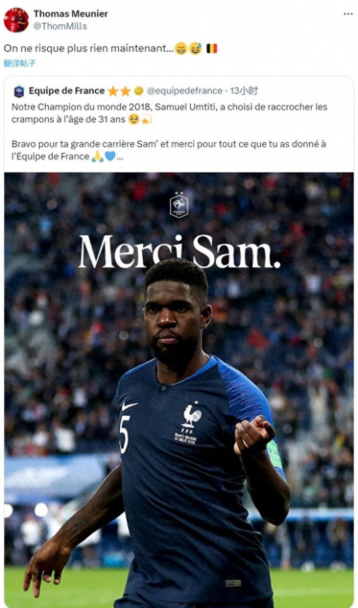 法国中卫乌姆蒂蒂宣布退役,法国队社媒发文致敬,穆尼耶转发这条动态,调侃道:“现在我们(比利时)再也不用担心了😁😅”