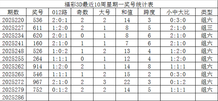 福彩3D第2025286期发哥推荐:
