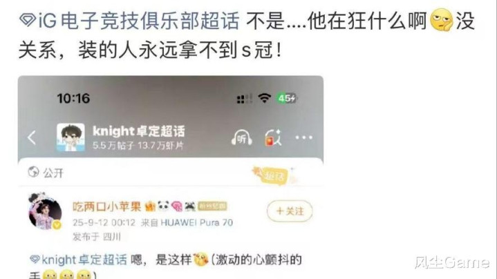 这位粉丝把左手的言论,分享了出来,结果IG粉丝直接应激了,超话里全在开团Knight,说他太装、太狂,永远拿不到世界赛冠军,其实左手的回应,已经给Rookie留面子了,因为两个英雄有克制关系,瑞兹就是好打兔子的,但Rookie对线没打好,被左手单杀,说只看ID已经很委婉了。