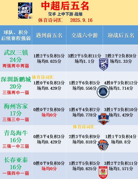 4、青岛海牛16分:【五强】0胜3平4负积3分,场均0.429分;【六中】2胜3平6负积9分,场均0.818分;【五弱】1胜1平3负积4分,场均0.8分。