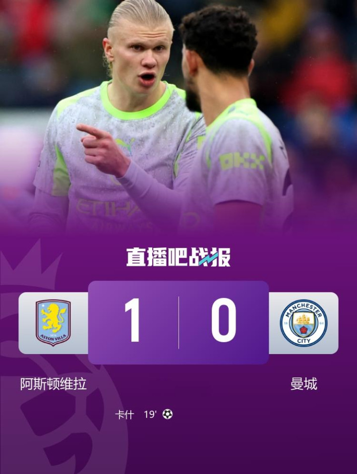 3连胜终结!曼城0-1维拉哈兰德失单刀连续12场进球中断卡什制胜
