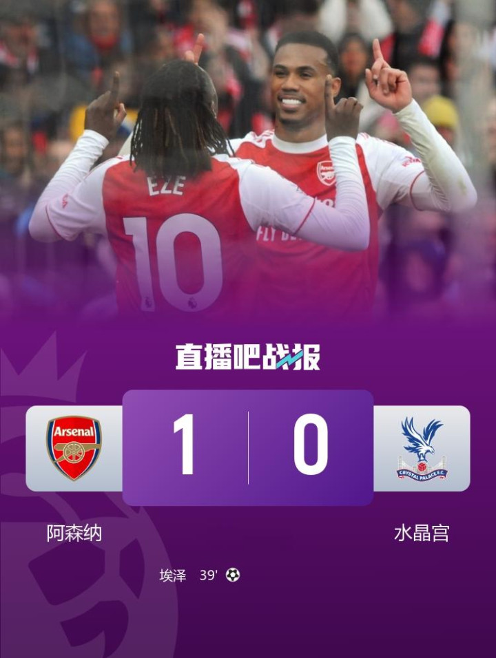 英超联赛第9轮,阿森纳1-0战胜水晶宫,埃泽弑旧主。