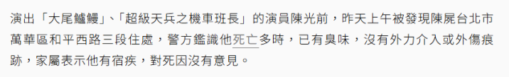 台湾男星陈光前家中死亡多日, 无人察觉已发臭, 王菲前经纪人悼念