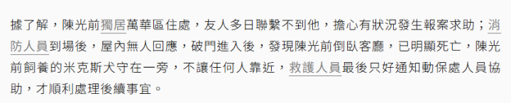 陈光前生前应该没有结婚,或者已经离异,尚且不知有没有子女,而他此前失联多日,要不是友人察觉不对劲,根本不相信他会突然猝逝。而据台媒报道,因为陈光前的门口养了一只米克斯犬,不让旁人靠近,而狗狗一直守在旁边,不眠不休陪伴主人最后一程,令人唏嘘。