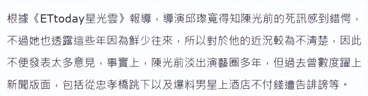 对于陈光前猝逝,王菲前经纪人邱黎宽受访悼念,称对他的死感到错愕,坦言近年鲜少来往,不清楚他的状况不便发言。
