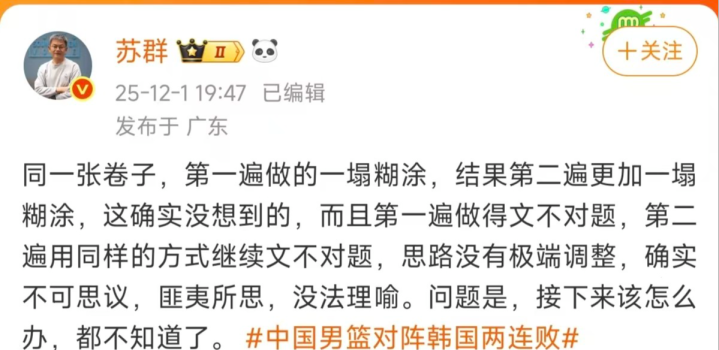 再看看篮球评论员苏群说:“同一张卷子,第一遍做的一塌糊涂,结果第二遍更加一塌糊涂,这确实没想到的,而且第一遍做得文不对题,第二遍用同样的方式继续文不对题,思路没有极端调整,确实不可思议,匪夷所思,没法理喻。问题是,接下来该怎么办,都不知道了。”确实中国男篮已经不是第一次输韩国了,明知道自己不足的地方,还是用同一样的人,基本一致的战术打法,人家都已经摸透你了。