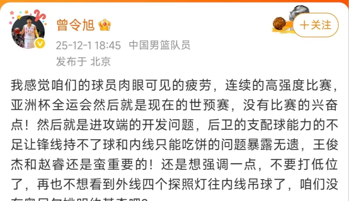中国男篮前队员曾令旭说到:“我感觉咱们的球员肉眼可见的疲劳,连续的高强度比赛,亚洲杯全运会然后就是现在的世预赛,没有比赛的兴奋点!然后就是进攻端的开发问题,后卫的支配球能力的不足让锋线持不了球和内线只能吃饼的问题暴露无遗,王俊杰和赵睿还是蛮重要的!还是想强调一点,不要打低位了,再也不想看到外线四个探照灯往内线吊球了,咱们没有奥尼尔姚明约基奇吧?”z最后一节男篮还是坚持用周琦这点来打,还有胡金秋的篮下得分来苦苦追分。