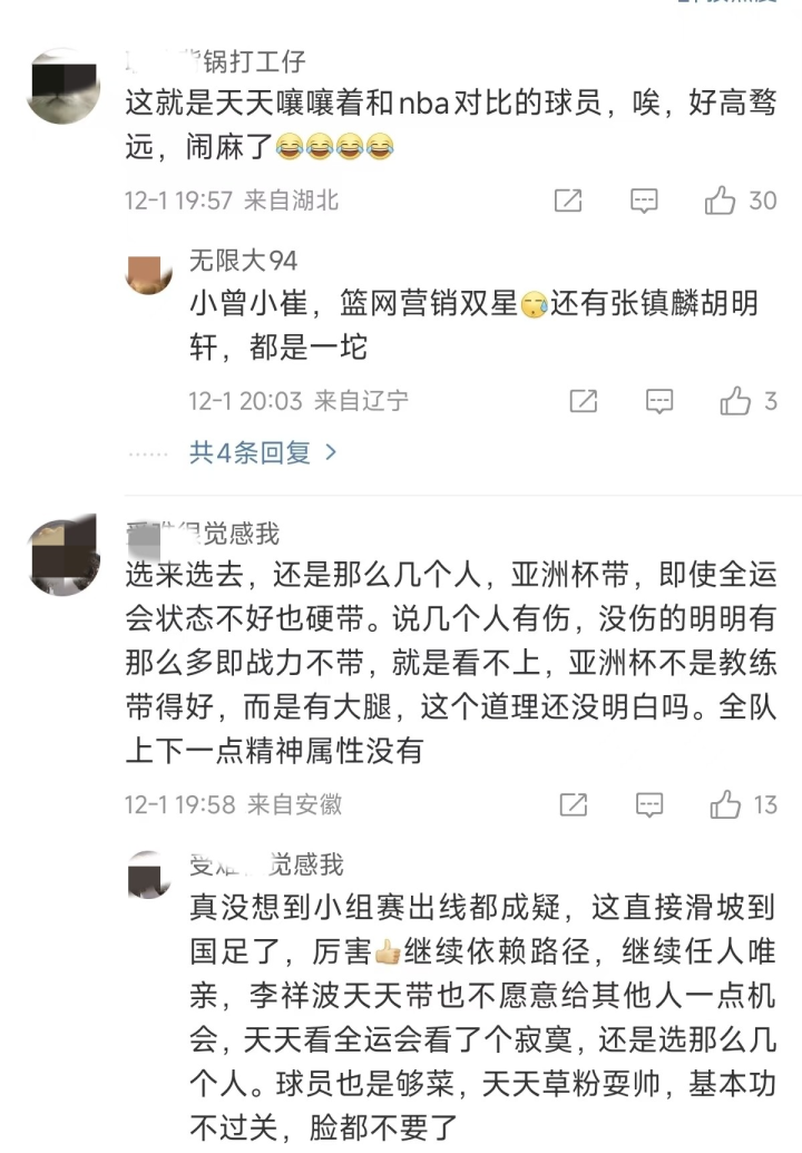 还有球迷说:“真没想到小组赛出线都成疑,这直接滑坡到国足了,厉害继续依赖路径,继续任人唯亲,李祥波天天带也不愿意给其他人一点机会,天天看全运会看了个寂寞,还是选那么几个人。球员也是够菜,天天草粉耍帅,基本功不过关,脸都不要了。”